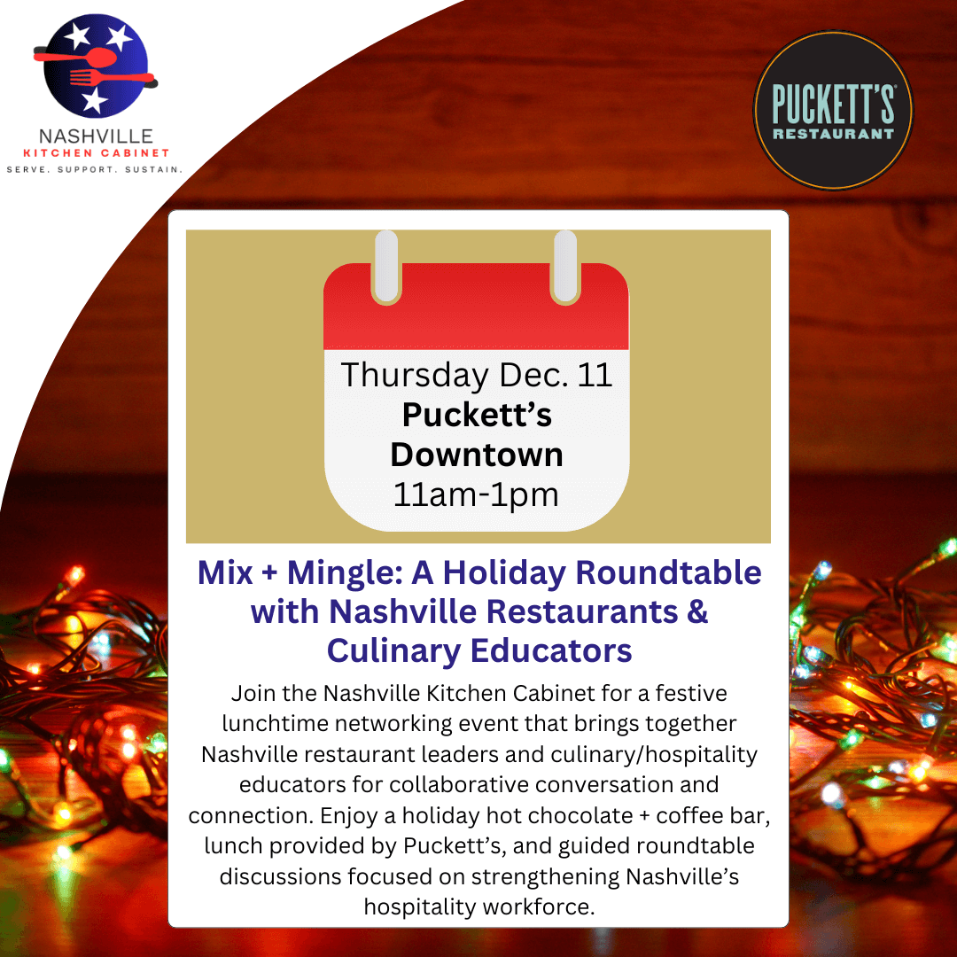 Join the Nashville Kitchen Cabinet for our final event of the year—a festive lunchtime gathering designed to bring together Nashville restaurant leaders and culinary/hospitality educators for meaningful conversation, collaboration, and connection.